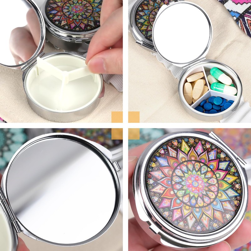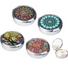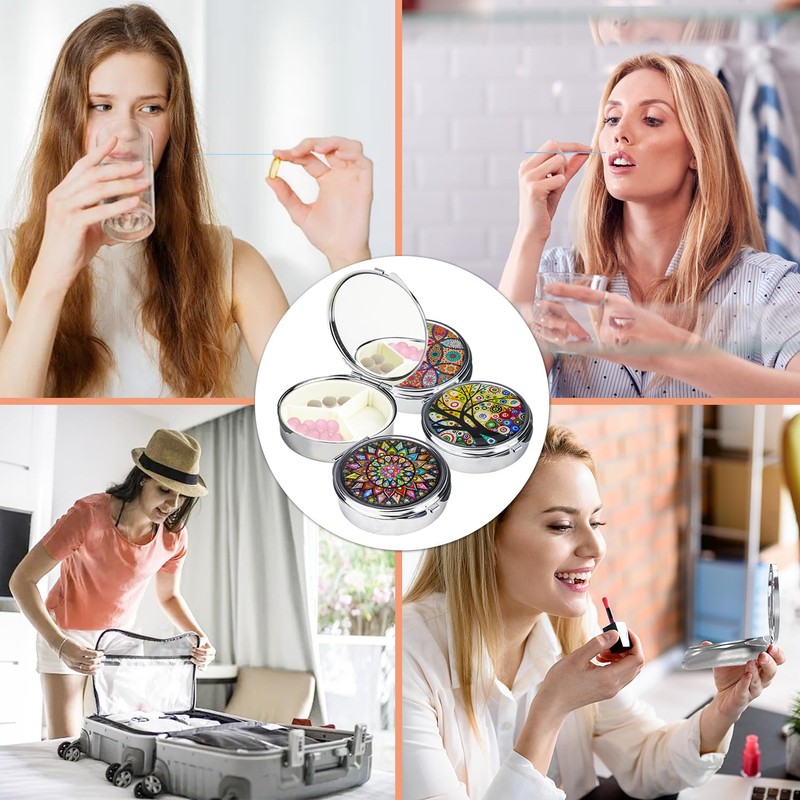 Prmape 4 Stück Pillendose, 3 Fächer Tablettenbox mit Spiege für Unterwegs, Tablettendose Metall Rund Mini Medikamentenbox