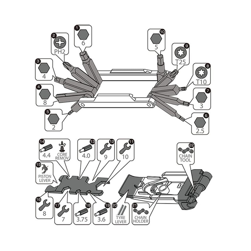 • Mini Tool Performance 22 Function Brand: Pro/PRO Shimano Part No: R20RTL0133X JAN Code: 8717009459907 Manufacturer Code: PRTL0133 Performance 22 Function Mini Tool With a much wider range of functions, the PRO Performance 22 Function Mini Tool is the most versatile mini tool in PRO. Upgrade your metacatuble handling ability and increase performance efficiency while riding with the PRO Mini Tool Performance 22 Function. As seen from the product name, the 22 features include an arren key, torque ski, driver and spoke wrench key which is needed to deal with metatatables while riding. Also included is a 12-speed chain tool, integrated tire lever. All items are compact aluminum mini tools and fit in the pockets of your saddlebags, storage bottles and riding jerseys. Mini Tool with 22 Functions - Mini Tool with Best Protection Range from PRO Products, Supports 12 Speeds, Includes 12 Speed Chain Tool, Integrated Tire Lever, Aluminum Construction, Hardened Steel Bits