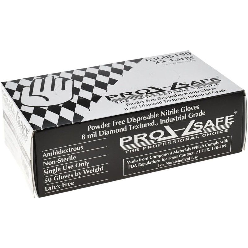 PRO-SAFE Industrial Grade 8 mil Diamond-Textured Disposable Nitrile Gloves: Black Size Large. 50 count powder-free disposable nitrile gloves by weight. 9-1/2" glove length. Made from component materials which comply with FDA regulations for food contact: 21 CFR 170-199. Non-sterile for non-medical use.