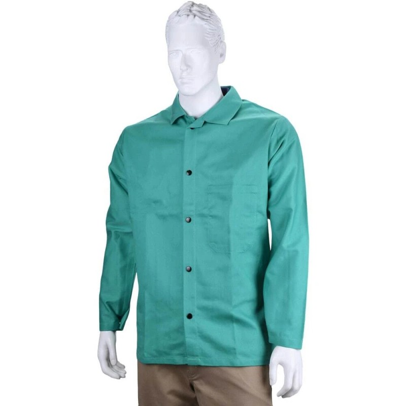 PRO-SAFE Welding Jacket: 9 oz Green Sateen Cotton with Snap Closure, 3X Large