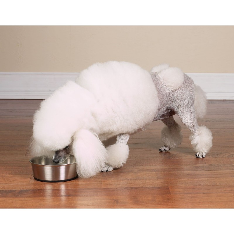 This stainless steel bowl with rubber base combine the durability and convenience. Stainless steel dog bowls with non-skid rubber bottoms that wont slip, slide or damage floors while dogs eat. Easy to clean bowls are dishwasher-safe and built to resist scratches, rust and denting. Bowl have 9-ounces capacity. Measures 4-1/2-inch width.