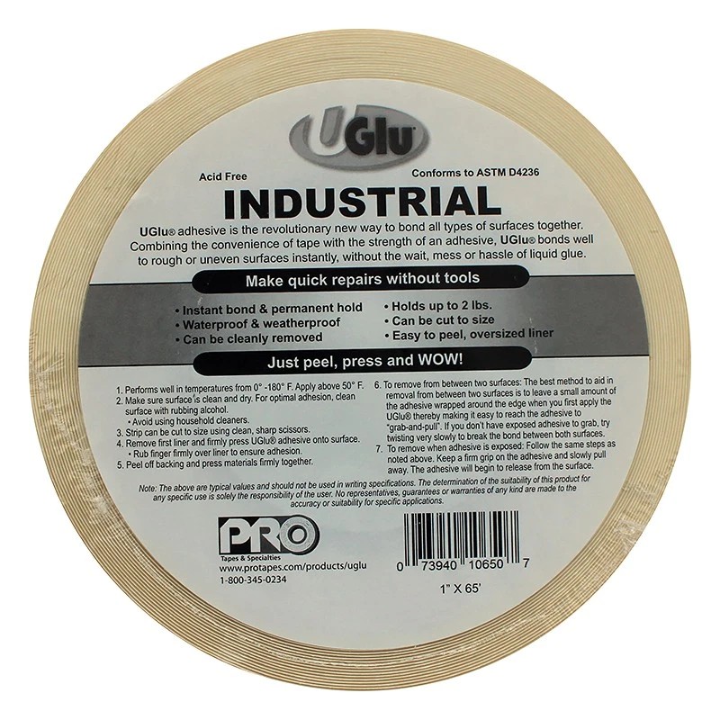 Pro Tapes UGlu Adhesive Tape is a double-sided adhesive transfer tape that combines the strength of adhesive with the convenience and ease of tape. UGlu bonds even rough and uneven surfaces instantly, without the wait, mess or hassle of liquid glue. Use for craft and kid projects, house repair and other outdoor jobs. Other features of UGlu include: