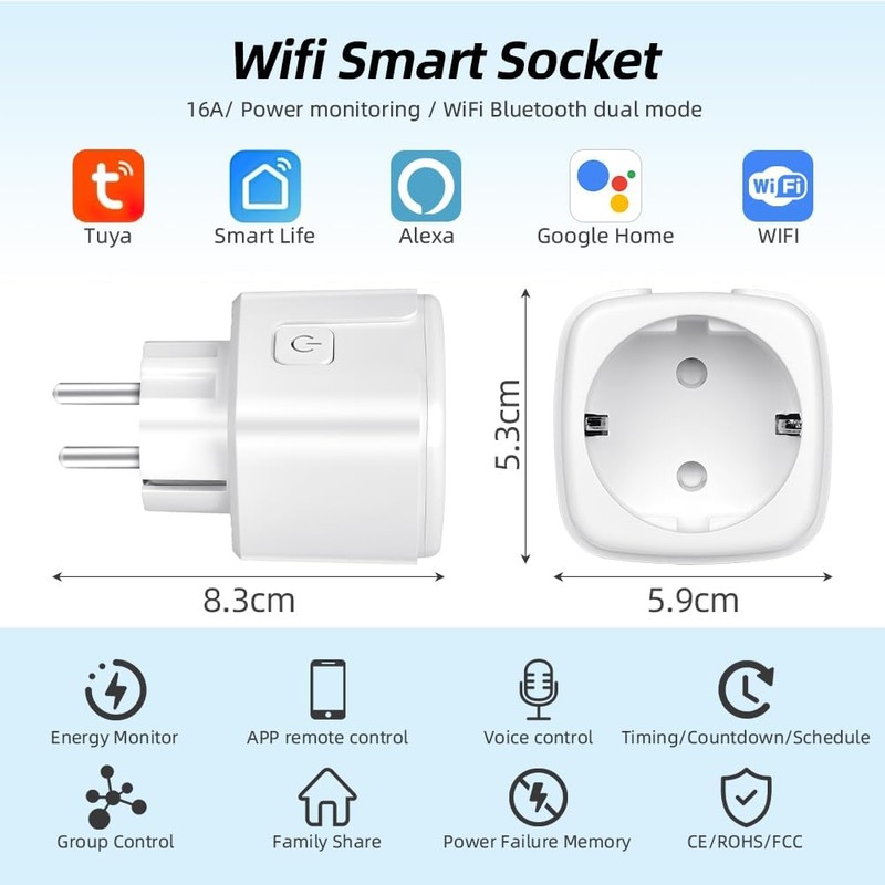 - Smart Socket:16A 3500W, works with 2.4GHz WiFi and has a wide range of applications, powerful features and small size. It supports the mobile phone app "Smart Life", the remote "Tuya Smart" and also supports voice control of Google Home Alexa. Due to its plug and play safety lock protection (to prevent children from suffering electric shock), without wiring, great practicality, low price and small size is a must for smart households.