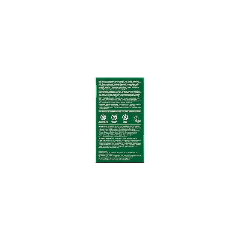 Each capsule in Probio7 Original contains 7 live strains of extensively researched "good" bacteria. Each capsule provides 4 billion friendly bacteria which are clinically proven to be safe and are naturally present in the human intestine. This has been complemented with two types of natural fibre which feed and encourage friendly bacteria in your digestive system.