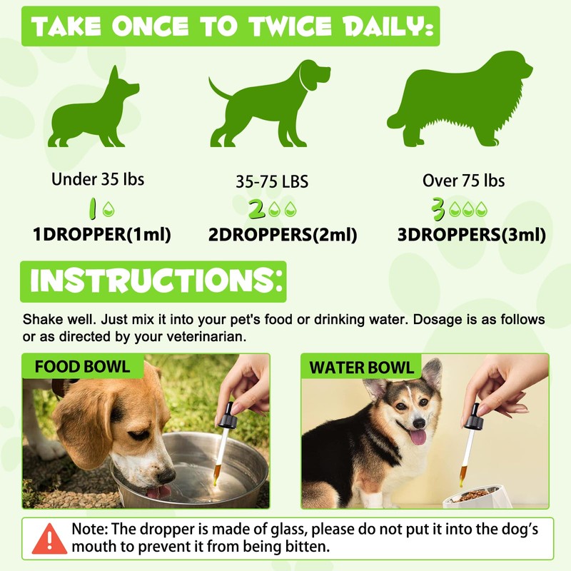 NOTE: The dropper is made of glass, Don't put it in the dog's mouth to prevent it from biting glass and causing injury to the dog.