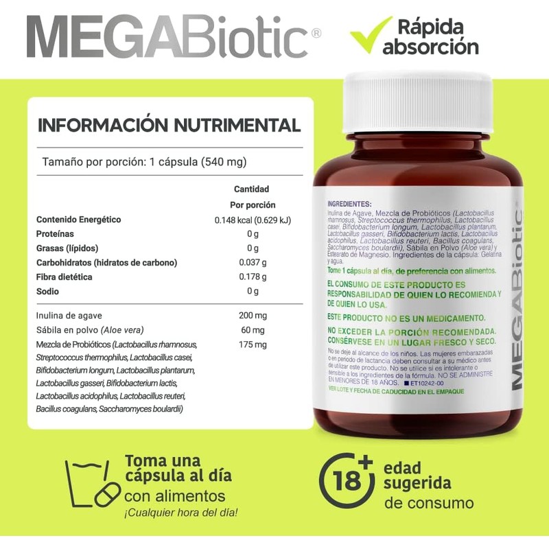 Probióticos 120 Billones y 11 Cepas e Inulina de Agave | Suplemento Alimenticio con Probióticos y Prebióticos con Aloe Vera y L. Rhamnosus |Cont. 90 caps, MegaBiotic