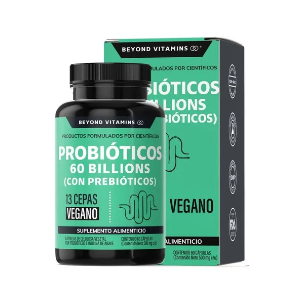 Probioticos 60 Billion UFC + Prebióticos Beyond Vitamins contiene probióticos con 60 Billones UFC (13 cepas) + Prebióticos con tecnología de encapsulado de 4 capas. Sin rellenos. Este producto es el resultado de investigación y estrictos estándares de control de calidad. Es ideal para hombres, mujeres y personas mayores. Nuestros Probioticos son libres de lácteos, soya, hormonas, antibióticos, conservantes, azúcar, colorantes y sabores artificiales. Es VEGANO.