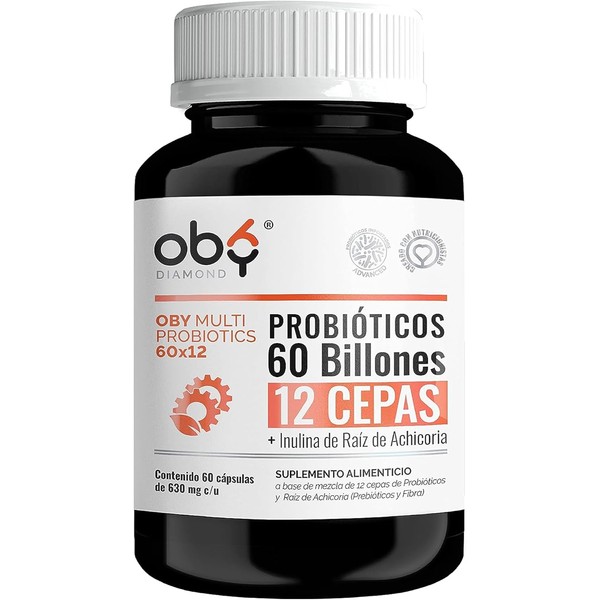 Probioticos 60 Billones de 12 Cepas + Prebioticos con Inulina Raiz de Achicoria | 60 cápsulas para 2 meses - Probioticos Mujer y Hombre | OBY MULTI Probiotics