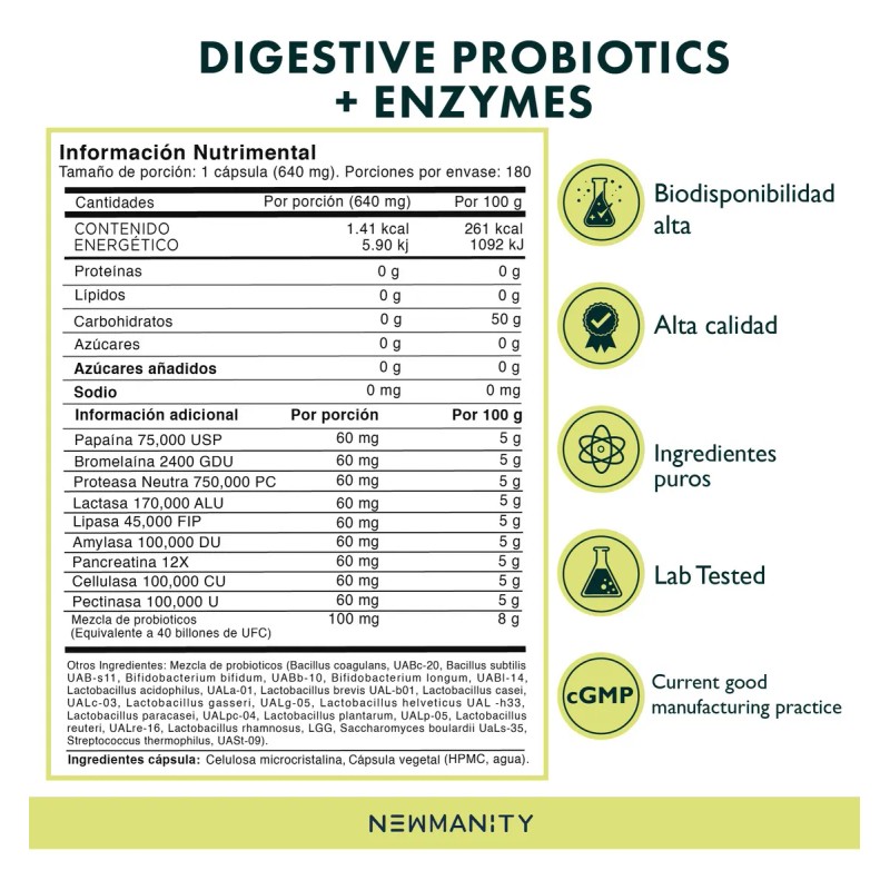 Probióticos con Enzimas 40 Billones Newmanity – 180 Cápsulas sin Sabor 🦠enzyme💊