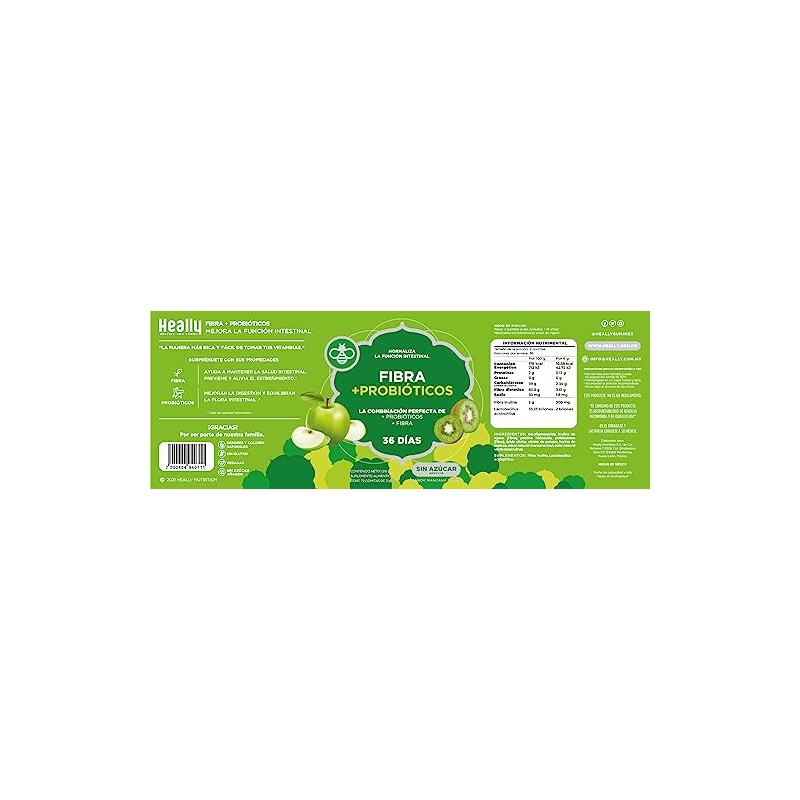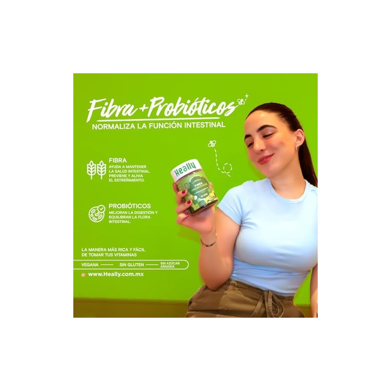 • kiwi y pigmentados con el color natural del alga espirulina. ✔ INGREDIENTES ACTIVOS – Nuestras gomitas están hechas con la mezcla ideal de ingredientes necesarios que puede ayudar a equilibrar la flora intestinal y a aliviar el estreñimiento. El suplemento Fibra + Probiótico contiene una mezcla de ingredientes como oligosacáridos, lactobacilos,inulina de agave y polidexterosa (fibras), pectina hidratada, ácido cítrico, citrato de potasio y harina de tapioca. ✔ PARA UNA MEJOR SALUD INTESTINAL – Un pequeño hábito saludable puede transformar completamente tu vida. Recomendamos consumir nuestros suplementos alimenticios por la mañana al despertar, con tu desayuno o justo antes de salir de casa para darle más a tus días. Recuerda que los grandes cambios siempre empiezan desde el interior. ✔ TU SATISFACCIÓN ES LO MÁS IMPORTANTE PARA NOSOTROS – En Heally estamos comprometidos con la satisfacción de nuestro clientes, en caso de que no estés satisfecho con tu compra o hayas tenido algún problema con tus productos por favor ponte en contacto con nosotros y con gusto te ayudaremos.