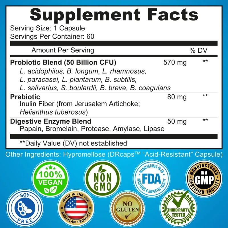 * 💪 **Digestión Optimizada:** Regula y mejora la absorción de nutrientes. * 🌱 **Fórmula Completa 3 en 1:** Probióticos, enzimas y prebióticos en una sola cápsula vegana. * 💯 **Máxima Absorción:** Cápsulas de liberación retardada para mayor biodisponibilidad. * ⏰ **Estables y Prácticos:** No requieren refrigeración, listos para usar en cualquier momento. * 🛡️ **Ingredientes Limpios:** Sin rellenos innecesarios, veganos y no transgénicos. * 🇺🇸 **Calidad USA:** Fabricados bajo los más altos estándares de calidad.