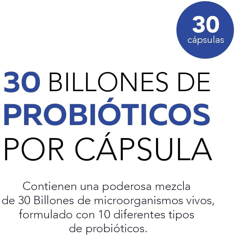 • 30 BILLONES. Refuerza la microbiota de tu organismo con estas poderosas cápsulas de 30 billones de probióticos y 10 diferentes tipos de cepas para mantener una digestión saludable y protegerte de bacterias que pueden afectar el tracto intestinal