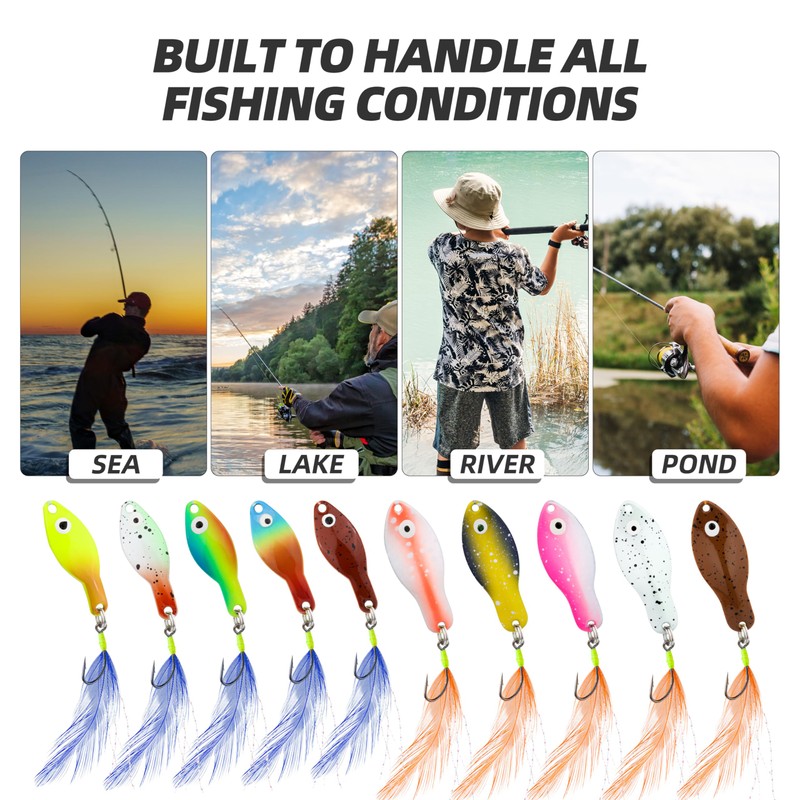 - 10pcs Assorted Set with Box: Comes with 10 different colors/sizes in a portable tackle box, great for targeting various fish species.