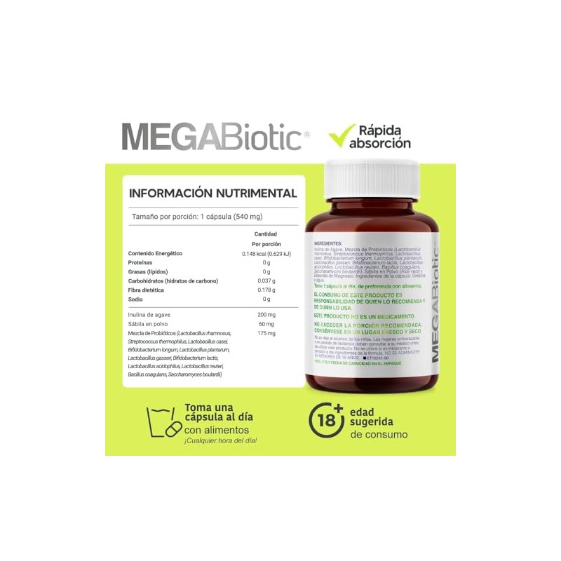 Probiticos 120 Billones y 11 Cepas e Inulina de Agave Suplemento Alimenticio con Probiticos y Prebiticos con L. Rhamnosus Cont. 60 caps, MegaBiotic