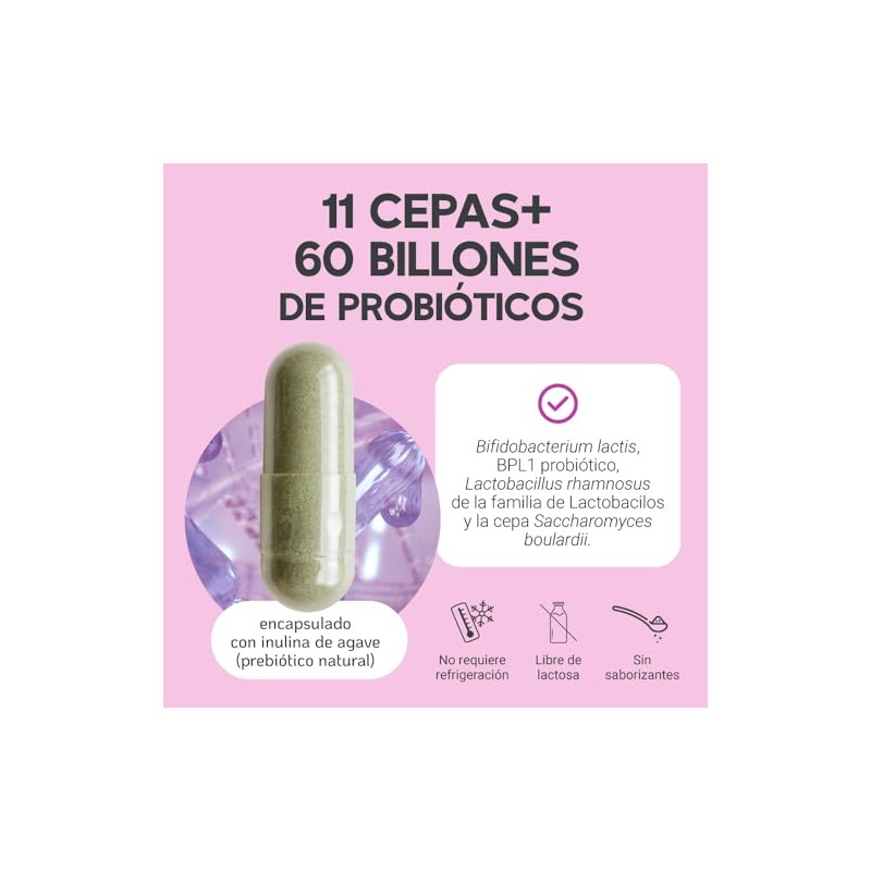 Probiticos 60 Billones y 11 Cepas e Inulina de Agave Suplemento Alimenticio con Probiticos y Prebiticos a Base de Sbila, B. Lactis y L. Rhamnosus...