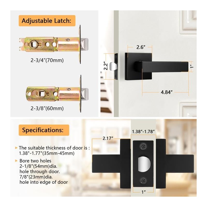 - Dimensions: Lever Length: 4.84"(123mm) , Rosette Diameter: 2.56"(65mm). It has adjustable universal latch - 2-3/8" or 2-3/4", Fits doors 1-1/4 inch to 1-3/4 inch. Note : The square plate of the latch is non-removable