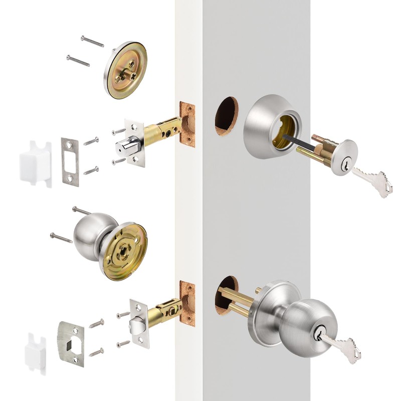 - [Entry door knob and single cylinder deadbolt set]This door handleset includes entry door knobs and single cylinder deadbolt,it can be locked/unlocked with a key from the outside and turn button from the inside.
