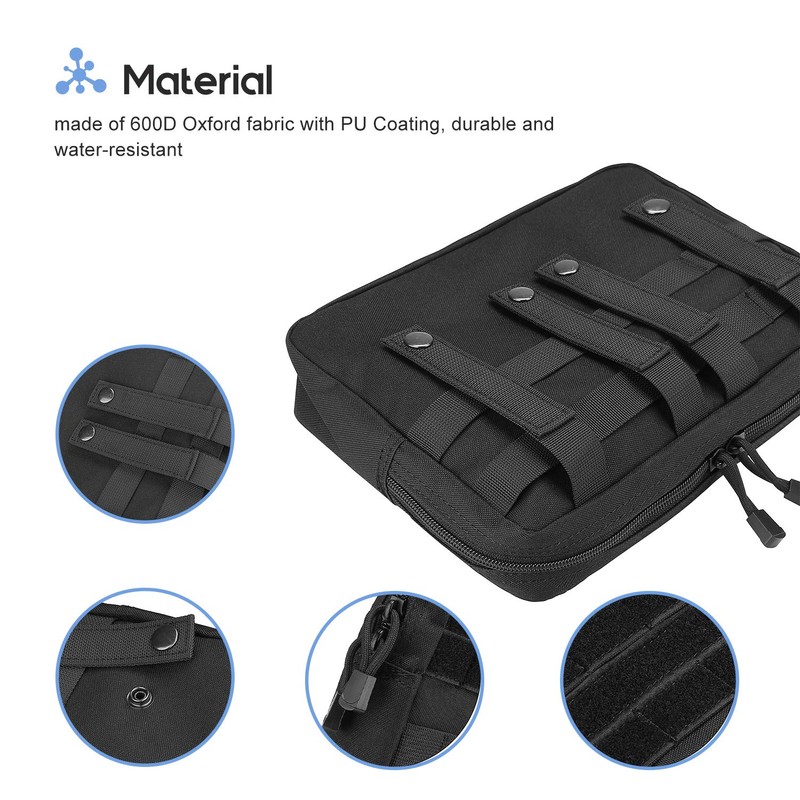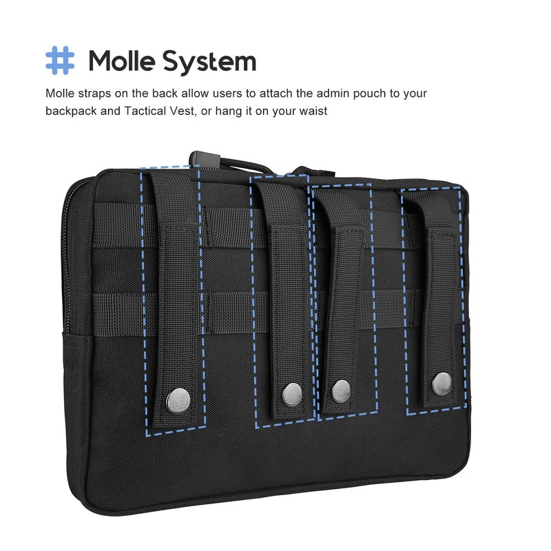 - Molle System: Molle straps on the back allow users to attach the admin pouch to your backpack and Tactical Vest, or hang it on your waist, expanding the Storage Spaces of your backpack