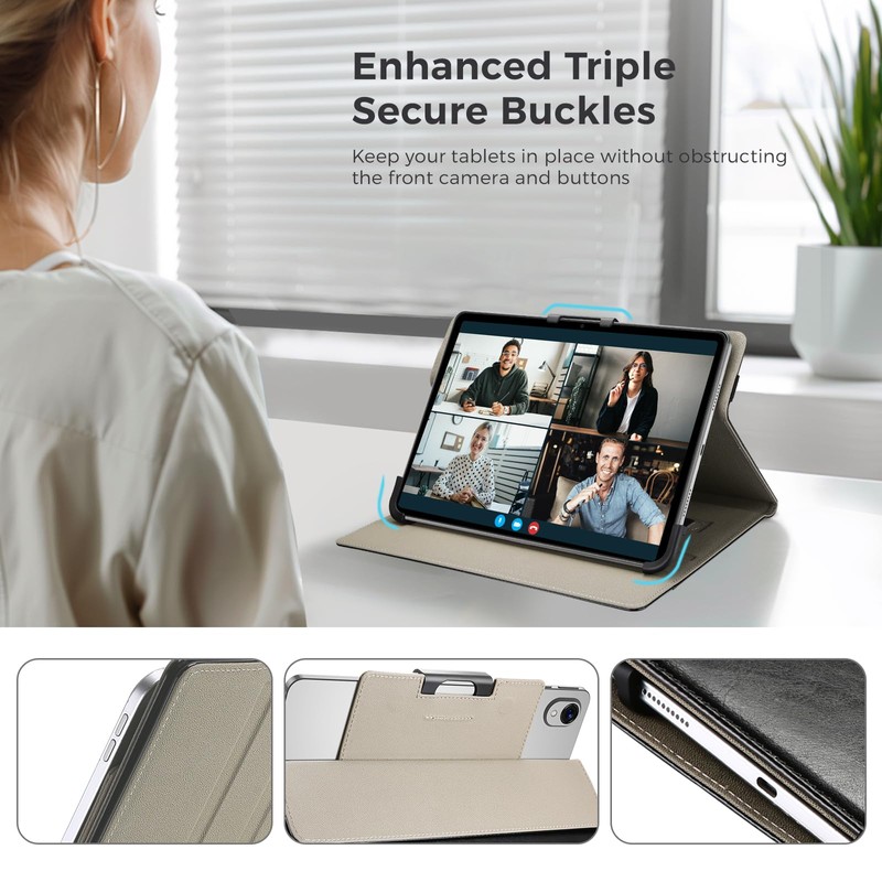 - Upgraded 3 secure buckles hold device firmly during use without blocking the buttons; Foldable back cover fits most tablet rear cameras better and is easier to use