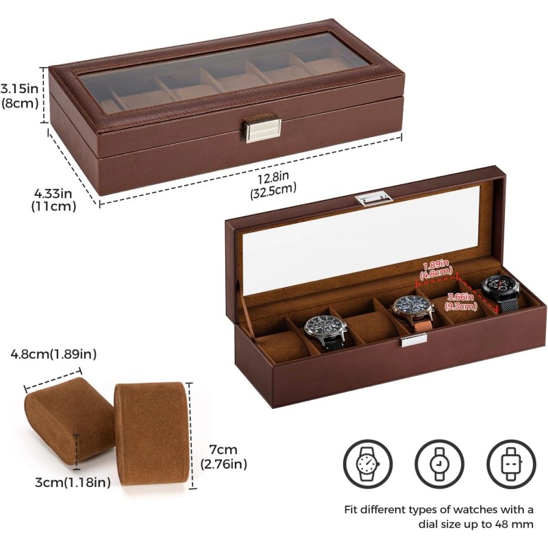 - [6-Slot] Dimension: 12.8"W x 4.33"D x 3.15"H (32.5*11*8cm); Watch Organizer can store 6 watches and fit different types of watches with a dial size up to 48 mm