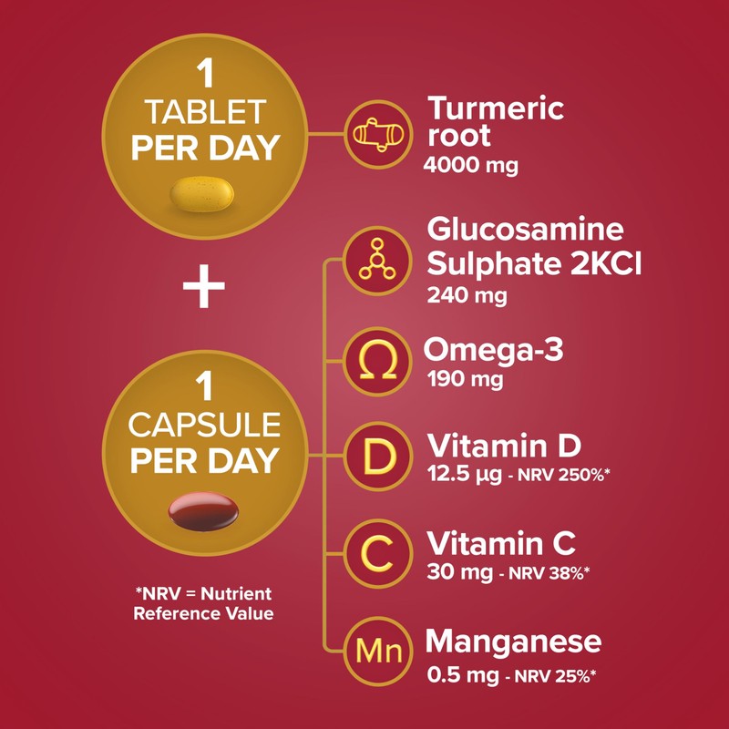 - INGREDIENTS: 1 capsule contains 240 mg Glucosamine Sulphate, 178 mg Omega-3 incl. 156 mg EPA & DHA; Vitamin C, Manganese, 100% NRV Vitamin D; 1 Turmeric tablet contains 4000 mg root (as 85 mg extract)