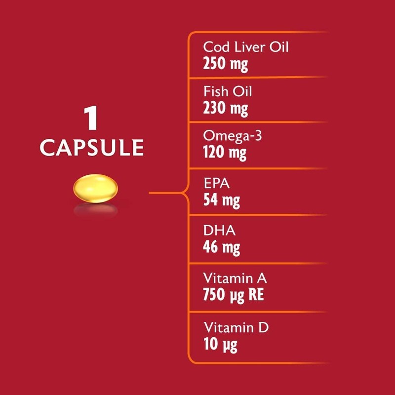 Designed for your Health. Seven Seas's Improved One-A-Day formula contains 230 mg of Fish Oil and 250 mg of Cod Liver Oil combined, a rich source of Omega-3 to support your health. It also includes the UK Government recommended level of vitamin D (10 g) to help support your immune system. These capsules contain 120 mg of Omega-3 and now, even higher levels of EPA and DHA. Seven Seas cod liver oils are in the triglyceride form, a more absorbable form bs ethyl esters