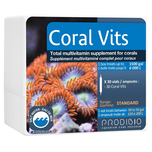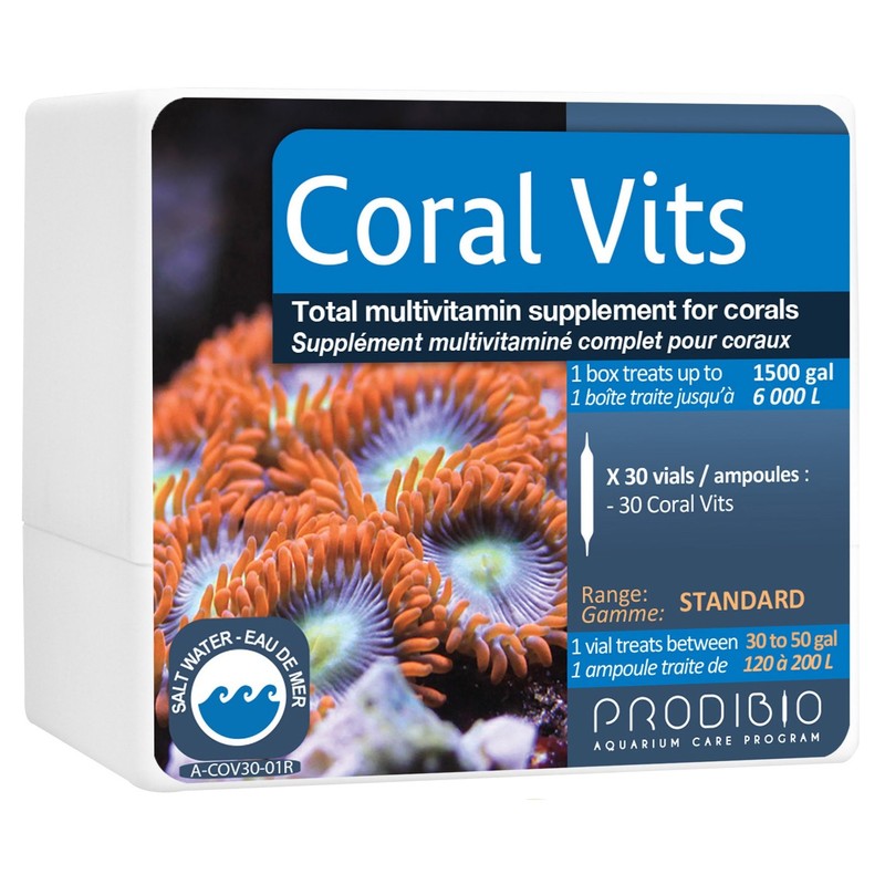 CORAL Vits is a hyper-concentrated solution containing all of the vitamins needed for good coral growth and for the well being of fish in reef and saltwater aquariums, without reaching doses likely to lead to hypervitaminosis (refer to instructions). Thanks to the patented Neogoutte technology, associated with Prodibio's vials, the formulation and packaging of CORAL VITS assures the protection of water-soluble vitamins (B1, B2, B3, B4, B5, B6, B7, B8, B9, B12) as well as lipophilic vitamins (A, C palmitate, D2, D3, E, K1, K2 and K3) Furthermore, their release in the aquarium is gradual, thus promoting optimal assimilation by marine organisms. During the different steps of coral propagation, using CORAL VITS accelerates tissue repair and reduces stress for both the mother colony and the fragments. CORAL VITS can be used in synergy with Prodibio's REEF BOOSTER, every 15 days. It can also be used alternately on one week, with Reef Booster added the next week. This second way to manage these sources of essential nutrients helps to bring vitamins regularly to corals and fish in the aquarium, and help their optimal growth.