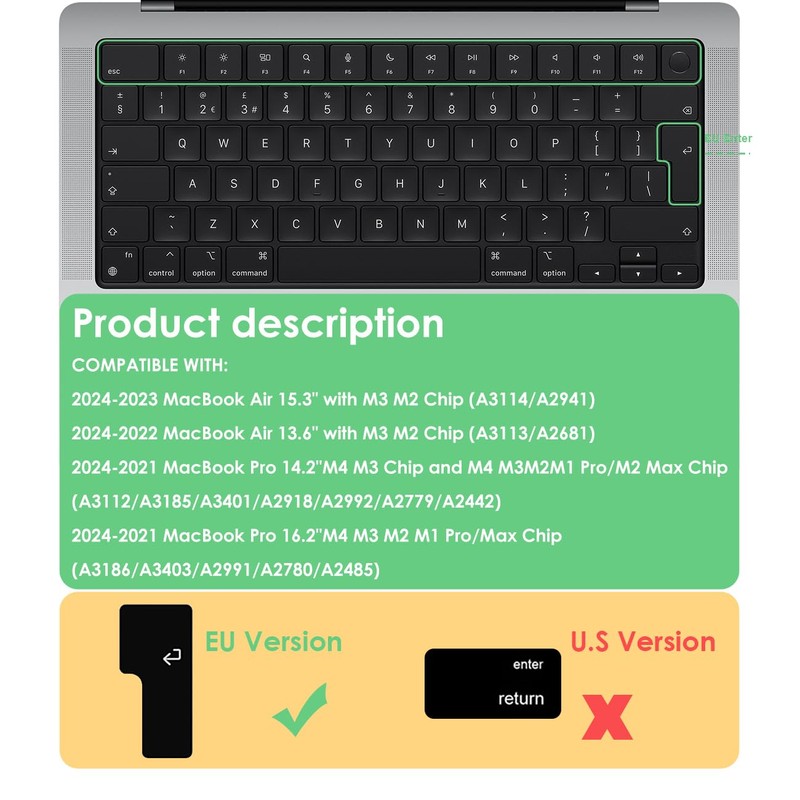 - Compatible with—EU/UK (ISO) Keyboard Layout for Canadian French Keyboard Cover: 2025-2023 MacBook Air 15 inch with M4 M3 M2 Chip (model A3241/ A3114 / A2941), 2025-2022 MacBook Air 13.6'' with M4 M3 M2 Chip (model A3240 / A3113 / A2681), 2024-2021 MacBook Pro 14.2'' (M4 M3 Chip and M4 M3 M2 M1 Pro/ M2 Max Chip, model A3112/A3185/A3401/A2918/A2992/A2779/A2442), 2024-2021 MacBook Pro 16.2'' (M4 M3 M2 M1 Pro / Max Chip, model A3186 / A3403 / A2991 / A2780 / A2485)