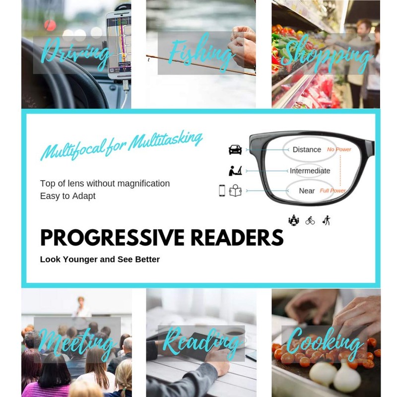 - ✔️LECTORES PERFECTOS: Para aquellos cuya visión a distancia aún es 20/20, los lectores multifocales son los mejores para realizar múltiples tareas. La parte inferior de la lente tiene toda la potencia de aumento para ver de cerca, como la pantalla de un teléfono inteligente. La parte media de la lente reduce su fuerza que le permite mirar una computadora. La parte superior de la lente tiene un aumento cero que le permite conducir o realizar cualquier tarea sin tener que poner