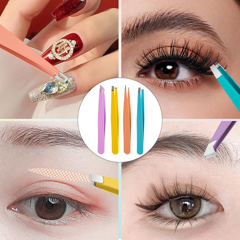 - 【4 Types of Tweezers】This set includes 4 tweezers with different tips to meet a variety of grooming needs: flat tip, angled tip, pointed tip, and slant tip. Each style is tailored for specific tasks such as shaping brows, removing splinters, or applying false lashes.