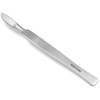 Dull callus scraper cream spatula for foot care. The overall size is 14.5 cm. The blunt trigger edge has a length of 2.5 cm. Made of stainless steel. Ideal for left- and right-handed users. Ideal beauty foot care instrument also ideal for travel.