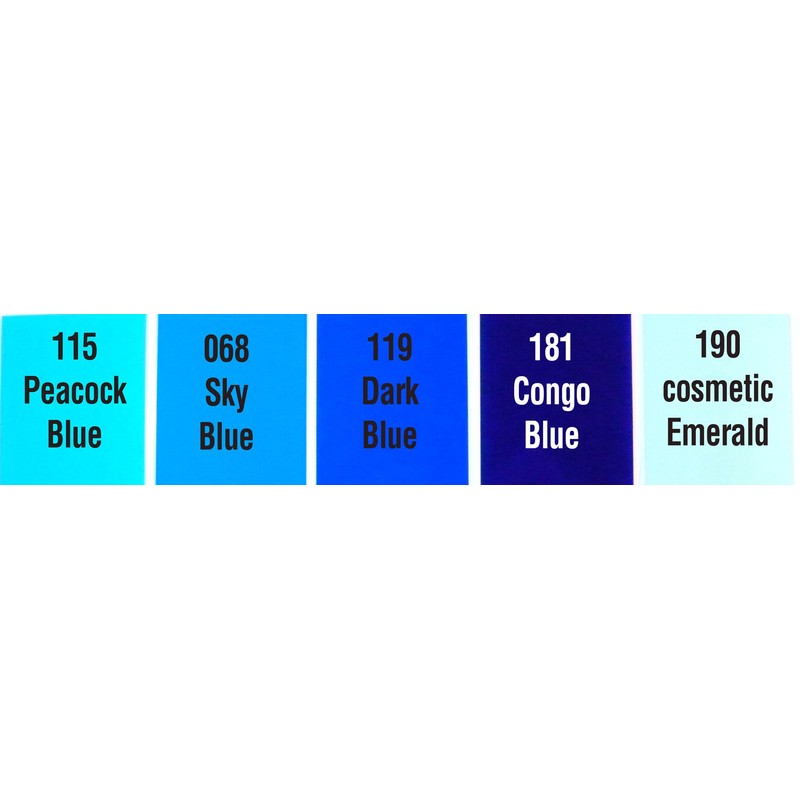 - On each item. 068 Sky Blue, 115 Peacock Blue, 119 Dark Blue, 181 Congo Blue, 190 cosmetic Emerald