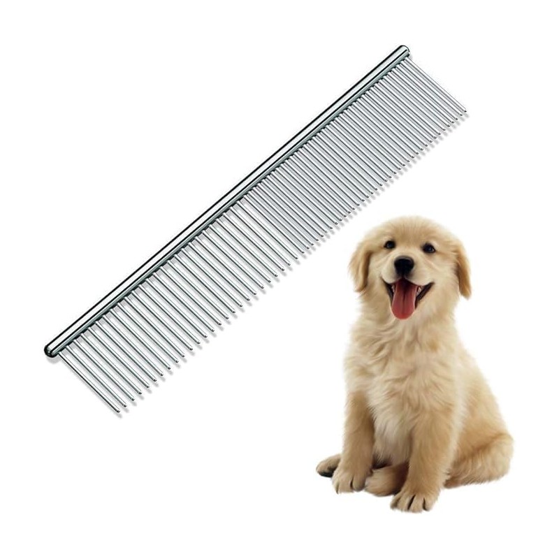 Professional Dog Grooming Comb, Stainless Steel, Dual-Spaced Rounded Teeth, Silver