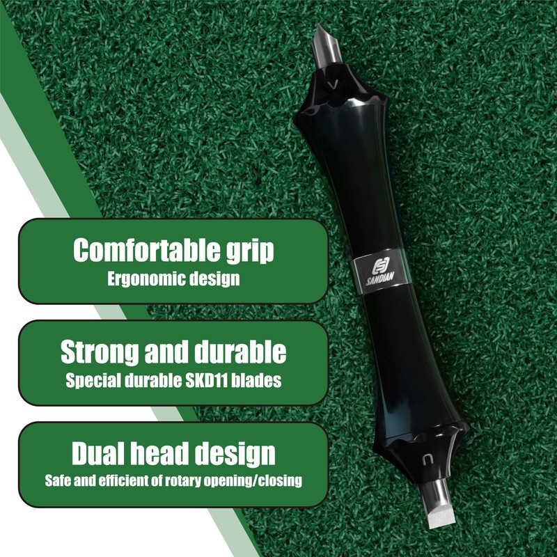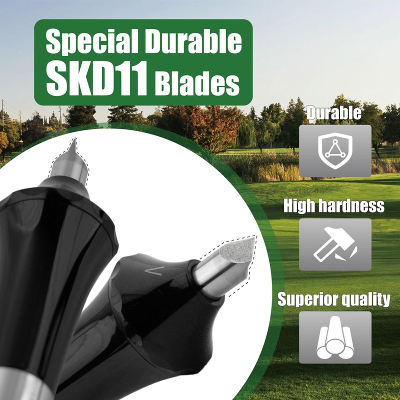 Elevate your golf game with this professional-grade dual blade golf club groove sharpener. Crafted from premium SKD11 steel known for its exceptional durability and high hardness, this precision tool helps restore your club's groove edges for optimal spin control and performance. The innovative dual-blade design features both U and V groove configurations to accommodate different club types and groove patterns. The ergonomic black handle provides comfortable grip and precise control during use. Includes a sturdy carrying case for protection and convenient storage. This essential golf maintenance tool helps maintain your clubs' performance by keeping grooves clean and sharp, potentially improving ball control and backspin. The superior quality construction ensures long-lasting reliability for seasons of use. Perfect for serious golfers who want to maintain their equipment at peak playing condition.