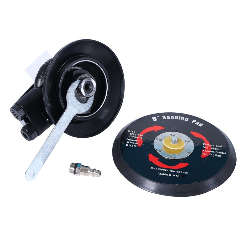 - Air Inlet:1/4", hook and loop sanding pad:6", Free speed: 12,000 revolutions per minute Average air consumption: 10.5 CFM;Air Pressure: 90 PSI