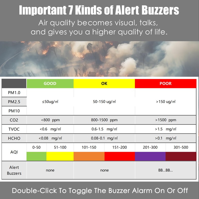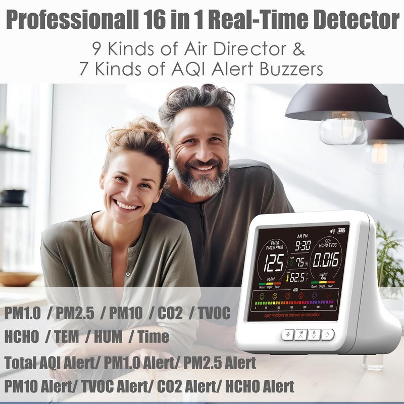 - 【Professional 16-in-1 Real-time Air Quality Monitor】: With real-time detection of PM1.0 | PM2.5 | PM10 | CO2 | TVOC | HCHO | TEM | HUM, along with 7 kinds of AQI alert buzzers function, this monitor ensures you always know what's in the air around you.