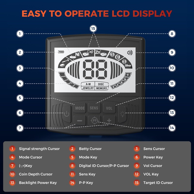 - 5 MODES INCL. PINPOINT & LCD BACKLIGHT: Easily adapt with 5 modes (All Metal, Discriminate, Notch, Custom, Pinpoint). The PP function precisely locates finds. This metal detector with pinpointer features a large backlit LCD, clearly displaying find type, depth, sensitivity & battery level, day or night.