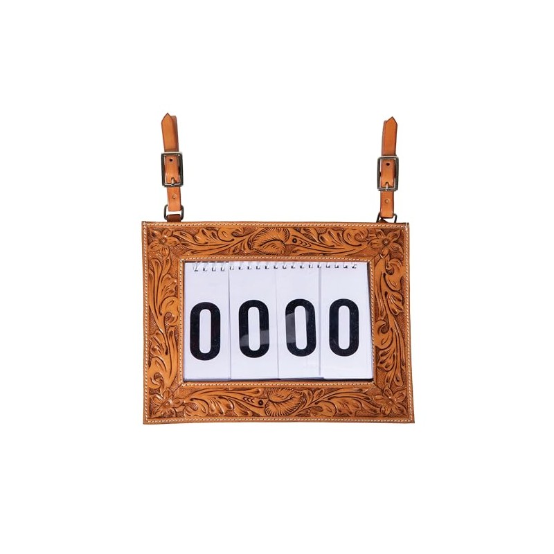 Tooled Number Holder features a beautiful tooled design in leather with adjustable tug straps to attach to the saddle. A set of changeable flip numbers are included. Color: Natural