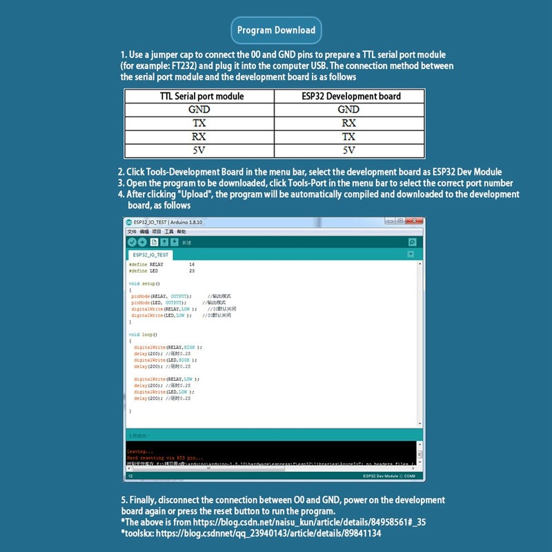 - For Development The I/O ports and UART program download ports of the ESP32 module are all exported, making it convenient for secondary development.