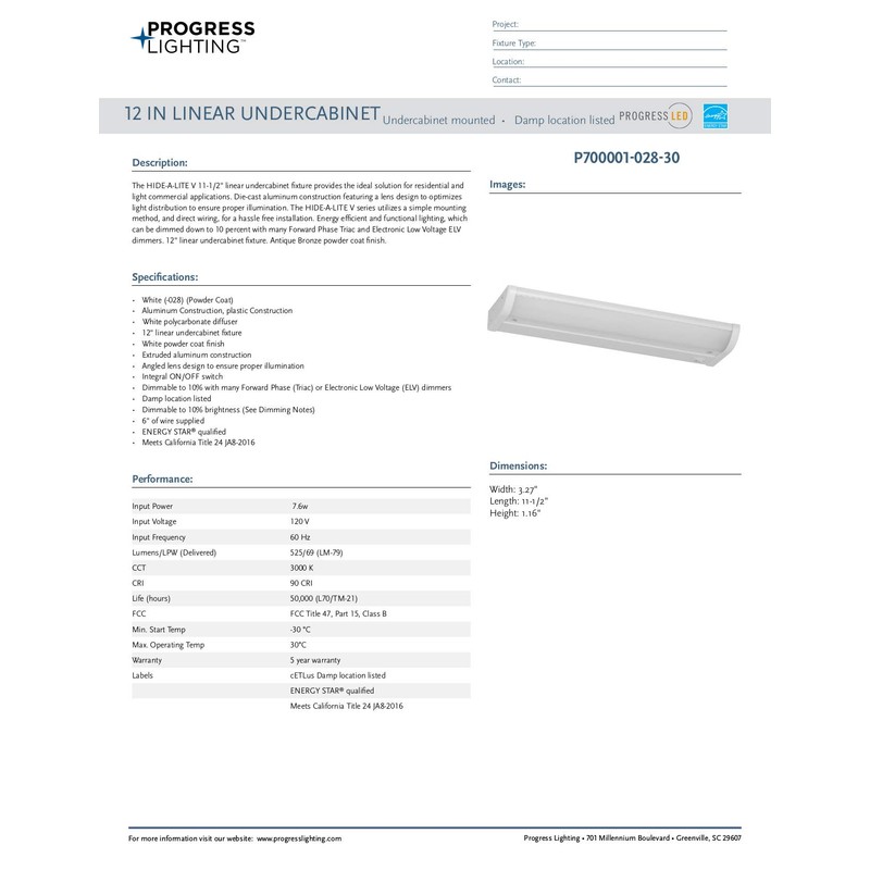 The HIDE-A-LITE V 11-1/2" linear undercabinet fixture provides the ideal solution for residential and light commercial applications. Extruded aluminum construction featuring a lens design to optimizes light distribution to ensure proper illumination. The HIDE-A-LITE V series utilizes a simple mounting method, and direct wiring, for a hassle free installation. Energy efficient and functional lighting, which can be dimmed down to 10 percent with many Forward Phase Triac and Electronic Low Voltage ELV dimmers. 12" linear undercabinet fixture. Antique Bronze powder coat finish.