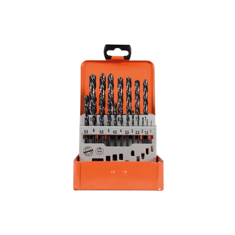- The metal case contains 19 short twist drills with cylindrical shank HSS-G DIN 338