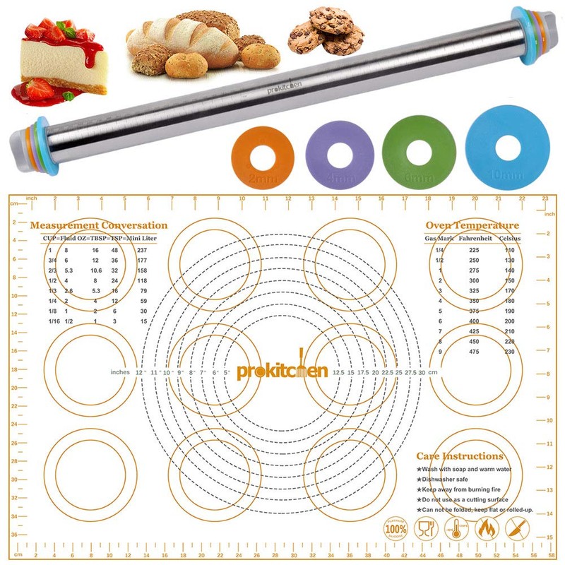 PROKITCHEN Adjustable Rolling Pin Dough Roller with Silicone Baking Pastry Mat, Stainless Steel Rolling Pins with Removable Thickness Rings Guides Spacers