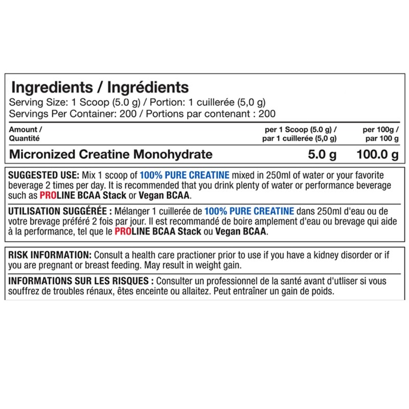 -Pro Line 100% Pure Micronized Creatine Monohydrate can be added to any beverage of your choice and mixes easily without having any creatine clumps due to it being micronized -Pro Line 100% 100% Pure Micronized Creatine Monohydrate features only creatine monohydrate which is a a naturally occurring amino acids (protein building block) -Creatine Monohydrate has been studied extensively and the benefits include increased muscle mass, improved strength, and an increase in power -With each serving size of Pro Line 100% Pure Micronized Creatine Monohydrate being 5 grams, there are a total of 200 full servings per container -Taking Pro Line 100% Pure Creatine is as easy as mixing one scoop (5 grams) into 250 ml of water or your preferred beverage of choice