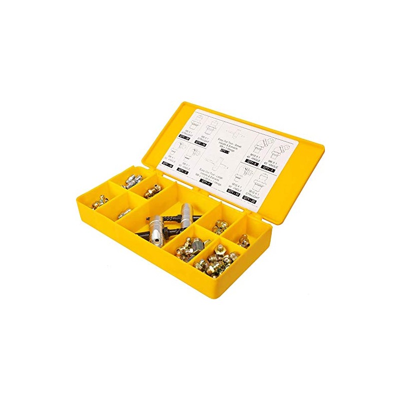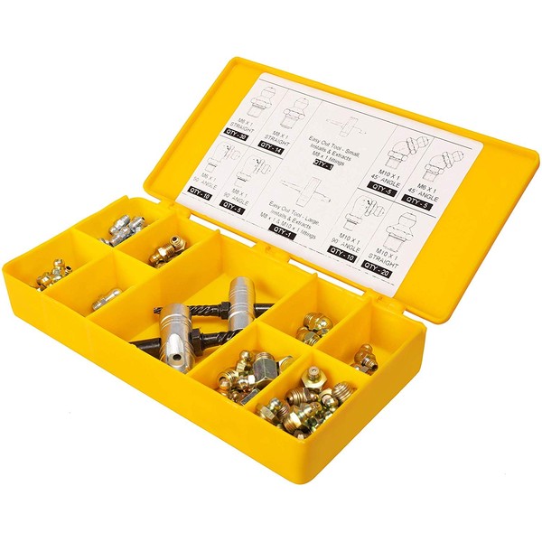 - Contstitutes of: Grease fitting M6 X 1 - Straight: 30 pc; 45° - 5 pc; 90° - 10 pc; Grease fitting M8 X 1 - Straight: 14 pc; 90° - 5 pc; Grease fitting M10 X 1 - Straight: 20 pc; 45° - 5 pc; 90° - 10 pc; Easy out tool (small) - 1 pc; Easy out tool (Large) - 1 pc;