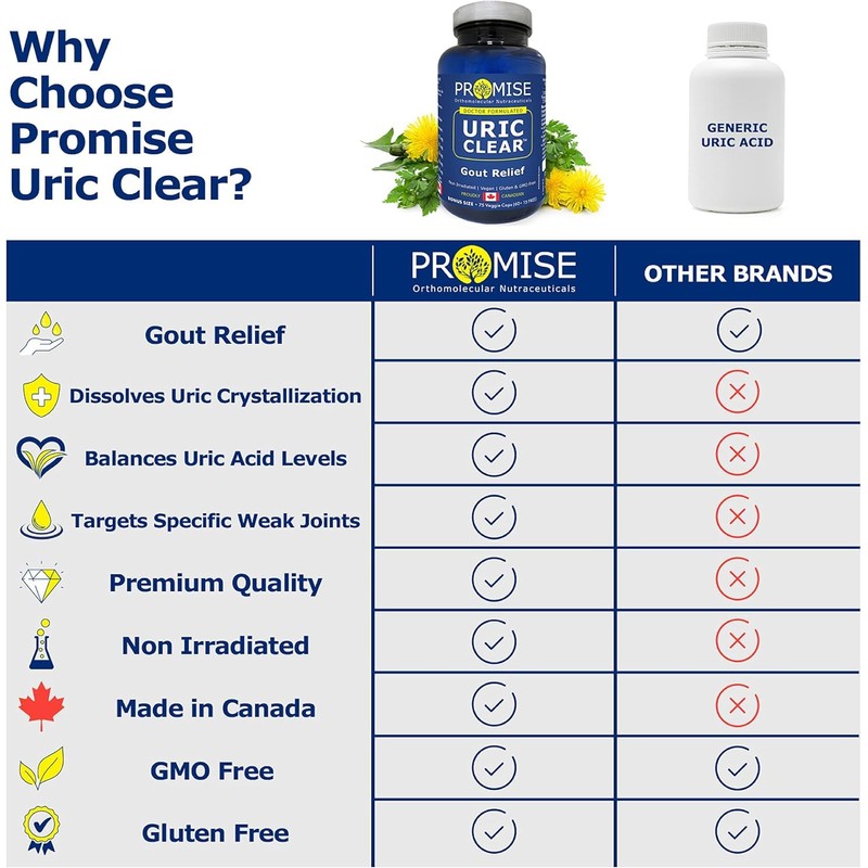 - Balances Uric Acid Levels - Excess uric acid can settle and even crystalize in your joints causing stiffness, soreness and discomfort that can last for days. Our Promise Uric Clear aids the body in maintaining balanced levels by flushing out excess uric acid to reduce flare-ups and support kidney function