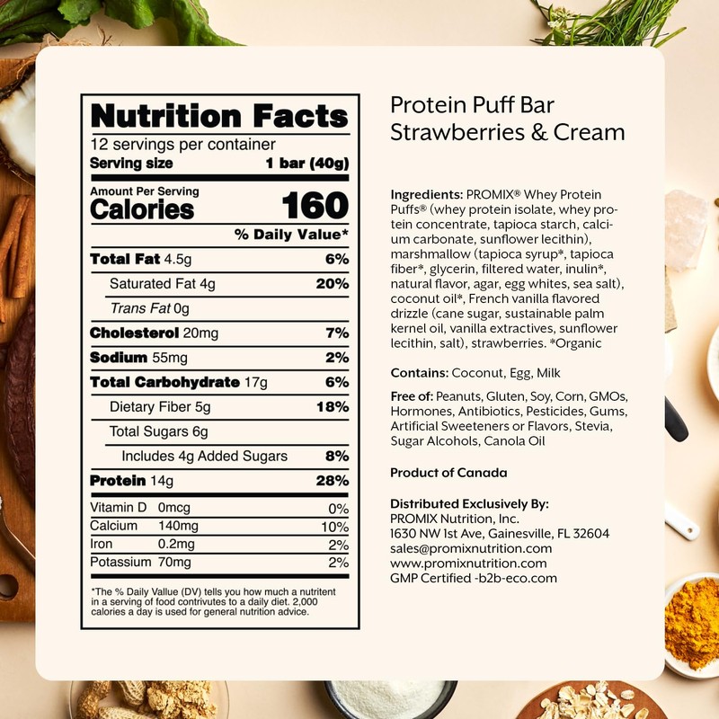 - A High-Protein Treat: Promix Protein Puff Bars combine our Whey Protein Puffs and marshmallow for a tasty, rice Krispy-like snack with 15g of protein and just 4g of sugar 40% less than the leading protein bar. Madagascar Vanilla Crisp flavor. 12 bars per box.