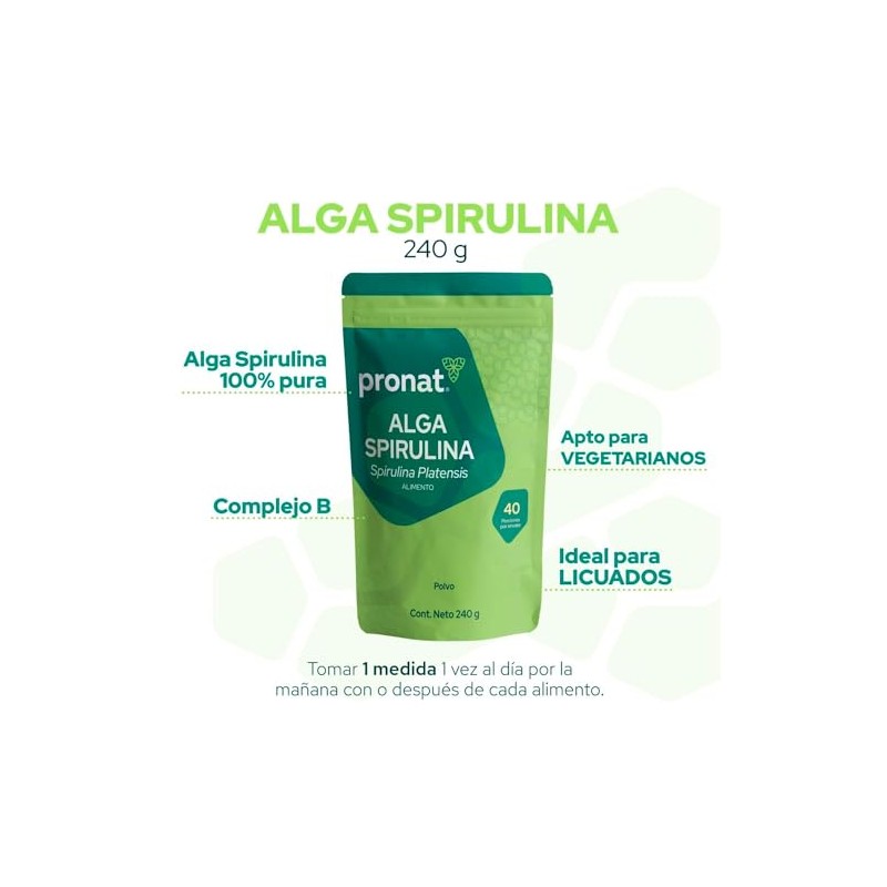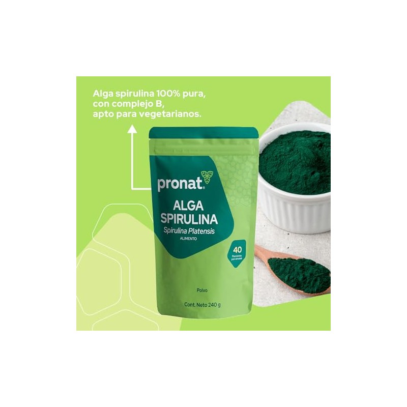 Acerca de este artículo LO QUE NECESITAS SABER. Bolsa con 240 gramos de Alga Spirulina 100% pura en polvo, ideal para licuados y smoothies, con nutrimentos auxiliares para una correcta alimentación en cualquier etapa de la vida. Es un producto no alérgeno y libre de gluten INGREDIENTES DESTACADOS. Aporta proteínas, clorofila, betacaroteno, vitamina E y vitaminas B1, B2, B3, B6, biotina y ácido fólico. Este producto se recomienda a partir de los 12 años BIENESTAR SIMPLE. Entendemos que llevar una vida sana puede ser complicado, por eso tenemos un portafolio enfocado en cada una de tus necesidades, simplificando tus elecciones. Te invitamos a averiguar sobre los beneficios del alga spirulina SIEMPRE TE RECORDAMOS. Este producto no es un medicamento. El consumo de este producto es responsabilidad de quien lo recomienda y de quien lo usa. Manténgase en un lugar fresco y fuera del alcance de los niños SOBRE PRONAT. Pronat es una marca con más de 45 años de experiencia en el mercado. Somos líderes en el segmento y ofrecemos productos de la más alta calidad, desarrollados en conjunto con nutriólogos y profesionales de la salud