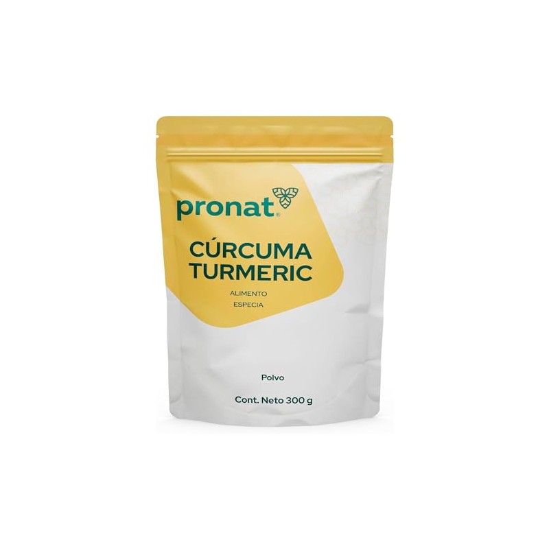Acerca de este artículo LO QUE NECESITAS SABER. Bolsa con 300 gramos de polvo de raíz de cúrcuma, ideal para agregar a licuados, sopas y otras recetas. Agrega aroma y color a los alimentos y se puede usar incluso en mascarillas para la piel INGREDIENTES DESTACADOS.Polvo de raíz de cúrcuma. La cúrcuma es una especia utilizada ancestralmente que puede ayudar a quienes quieren mejorar su digestión BIENESTAR SIMPLE. Entendemos que llevar una vida sana puede ser complicado, por eso tenemos un portafolio enfocado en cada una de tus necesidades, simplificando tus elecciones. Te invitamos a averiguar sobre los beneficios de la cúrcuma SIEMPRE TE RECORDAMOS. Manténgase en un lugar fresco y fuera del alcance de los niños SOBRE PRONAT. Pronat es una marca con más de 45 años de experiencia en el mercado. Somos líderes en el segmento y ofrecemos productos de la más alta calidad, desarrollados en conjunto con nutriólogos y profesionales de la salud
