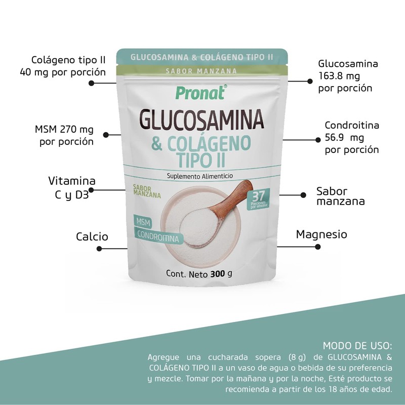 Pronat | Glucosamina & Colágeno Tipo II | Sabor manzana, con Vitamina C y D3, contiene colágeno hidrolizado y gluconato de magnesio