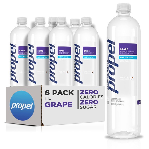 - Contains 6 (1L) bottles of Propel Water Grape Flavored Water with Electrolytes, Vitamins and No Sugar